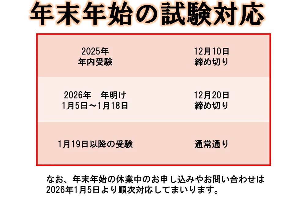 ※申し込み締切は試験日の7日前までとなります。(2月~4月は例年大変混みあいますので余裕をもってお申込みください)
