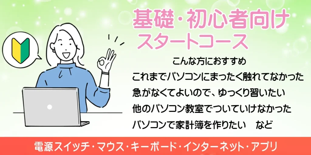 パソコンを触るのがちょっと苦手で活用出来ていない方や、これからやらなきゃならなくなった方向けに、パソコンを楽しく使って頂く事を目的とした入門のコースです。